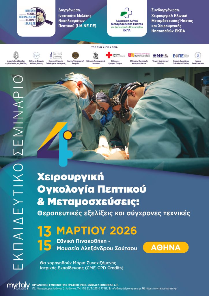 από το Ινστιτούτο Μελέτης Νεοπλασμάτων Πεπτικού (Ι.Μ.ΝΕ.ΠΕ.), σε συνεργασία με τη Χειρουργική Κλινική Μεταμόσχευσης Ήπατος και Χειρουργικής Ηπατοπαθών του ΕΚΠΑ 13 –15 Μαρτίου 2026, Εθνική Πινακοθήκη –