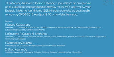 Ιούν32015ΝέαΣυμμετοχή του Προέδρου της ΕΕΜΗ, Καθηγητή κ. Γ.Ν. Νταλέκου, στη Συνέντευξη Τύπου για τη νέα καμπάνια του Συλλόγου Ασθενών Ήπατος ΠΡΟΜΗΘΕΑΣ “ΕCΥ ΕΚΑΝΕΣ ΤΟ TEST?”, την Τρίτη 9/6/2015 και ώρα 12.00 στην ΑΙΓΛΗ Ζαππείου. Δείτε εδώ την πρόσκληση Κατηγορία Νέα3 Ιουνίου 2015 Μοιραστείτε το! Share on FacebookShare on Facebook Share on XShare on X Share on LinkedInShare on LinkedIn Share on WhatsAppShare on WhatsApp Post navigationΠροηγούμενοPrevious post:Κοινή ανακοίνωση ΕΕΜΗ – ΠΡΟΜΗΘΕΑΕπόμενοNext post:9ο Σχολείο Κλινικής ΗπατολογίαςΣχετικά ΆρθραΕκδημία Καθηγητή Στ. Ι. Χατζηγιάννη17 Νοεμβρίου 2025Προκήρυξη υποτροφιών εξωτερικού για μετεκπαίδευση στην Ηπατολογία για το έτος 202617 Νοεμβρίου 2025Sex and body size disparities under MELD 3.0: Evaluation of persisting gaps in liver transplant access16 Νοεμβρίου 2025Δελτίο Τύπου για το ηπατοκυτταρικό καρκίνωμα11 Νοεμβρίου 2025Prognostic implications of recompensation of decompensated cirrhosis after SVR in patients with hepatitis C6 Νοεμβρίου 2025Meta- Analysis: Comparison of Living Versus Deceased Liver Transplantation for Primary Sclerosing Cholangitis4 Νοεμβρίου 2025